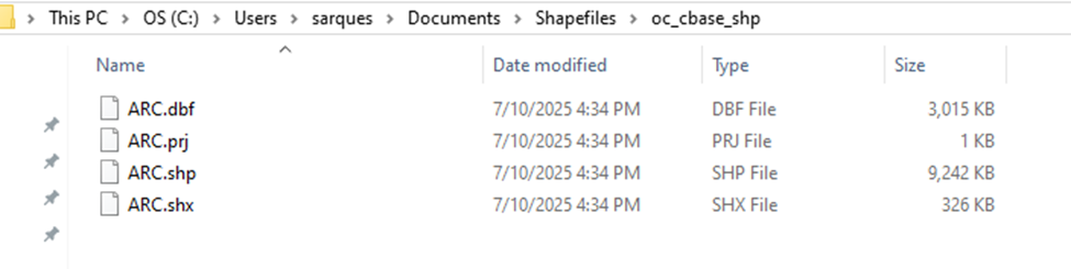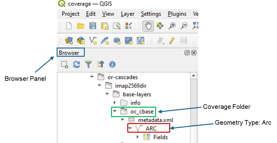 In the screenshot below, I can see that my coverage folder "oc_cbase" contains ARC (Line String),