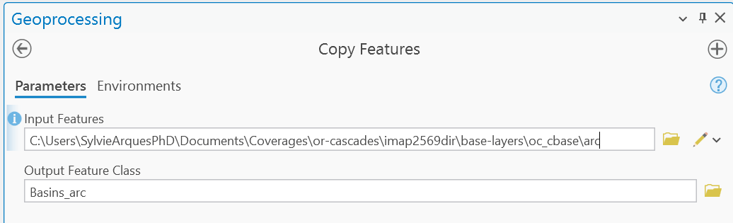 - In the Input Features box, type/copy/paste the full path to the geometry. You can try polygon, arc, point, or label depending on what the coverage contains