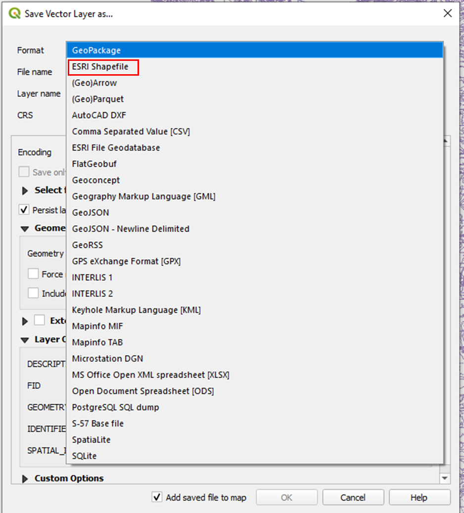 - In the Save Vector Layer as... dialog, choose ESRI Shapefile as the format.