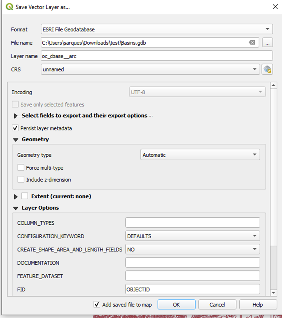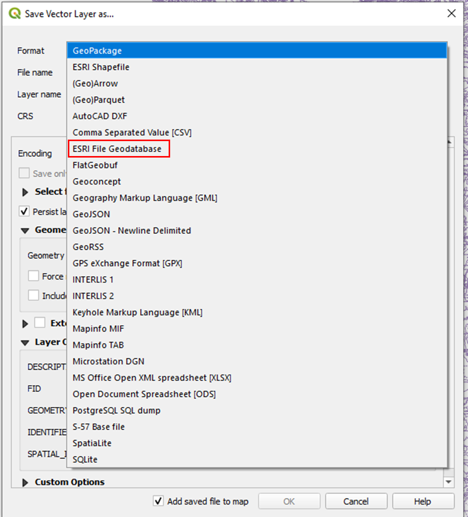 - In the Save Vector Layer as... dialog, choose ESRI File Geodatabase as the format.