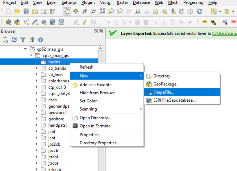 - Select New > Shapefile.. (or Geopackage or ESRI FileGeodatabase)
