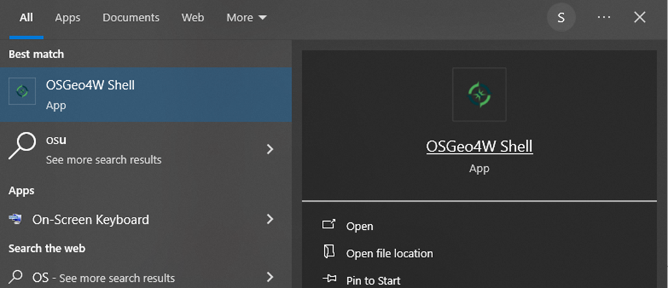 - Go to Start Menu > search for “OSGeo4W Shell” or Terminal (macOS/Linux)